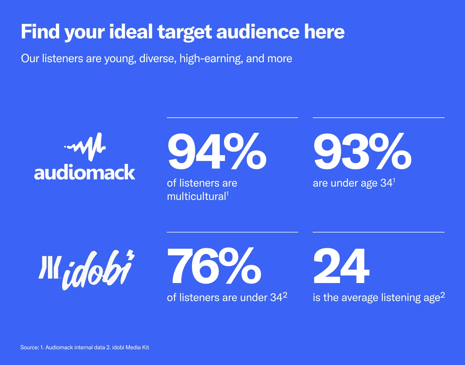 Our exclusive relationships with partners like Audiomack and idobi enable brands to effortlessly extend reach to key audiences all in one partnership. And many of these listeners are young and diverse, giving you more opportunities to reach your ideal audience—whether they’re Black, Hispanic, Gen Z, or affluent.