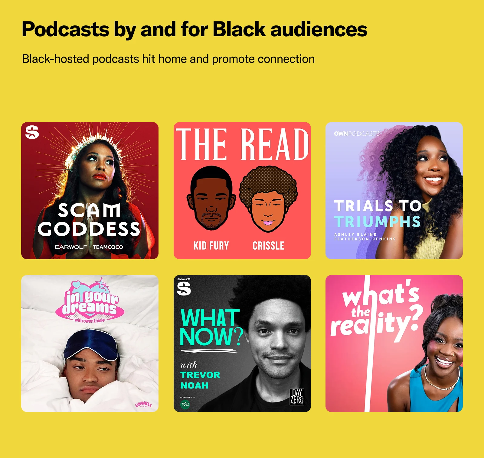 Podcasts connect Black audiences to their culture, so brands should work to keep up with the changing podcast landscape and invest in diverse creators. The SiriusXM Podcast Network is home to dozens of iconic voices within the Black community, with many sparking cultural conversations across the country. And because we don’t need a reason to celebrate Black podcasts, we’re shining a spotlight on our library of Black-hosted shows. How many of these have you added to your queue?