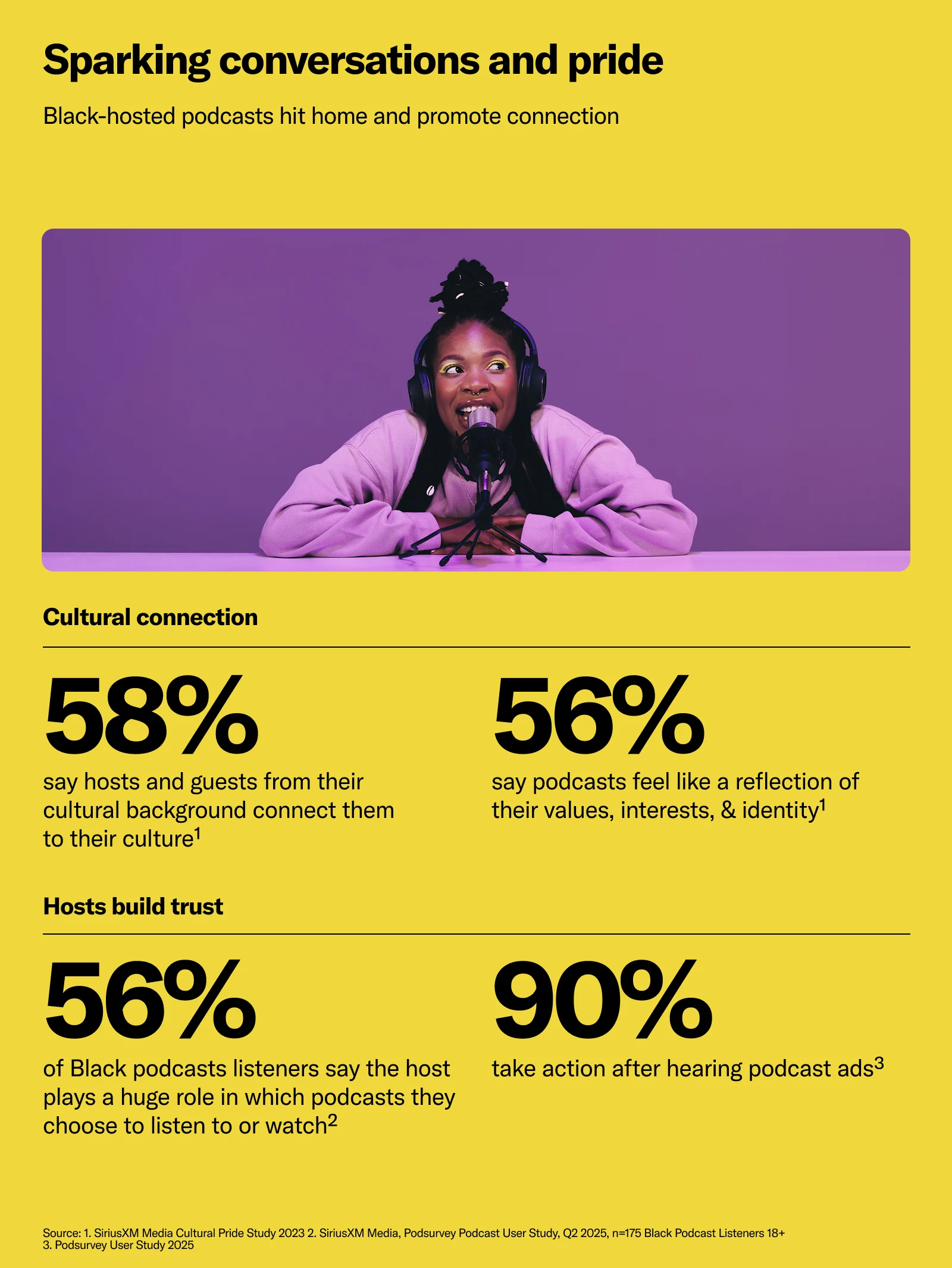 What better way to hear about cultural events than via audio? From getting insight on issues that hit home to staying updated on pop culture and news, over half of Black listeners say themes and messages that reflect their cultural experiences connect them to their culture.