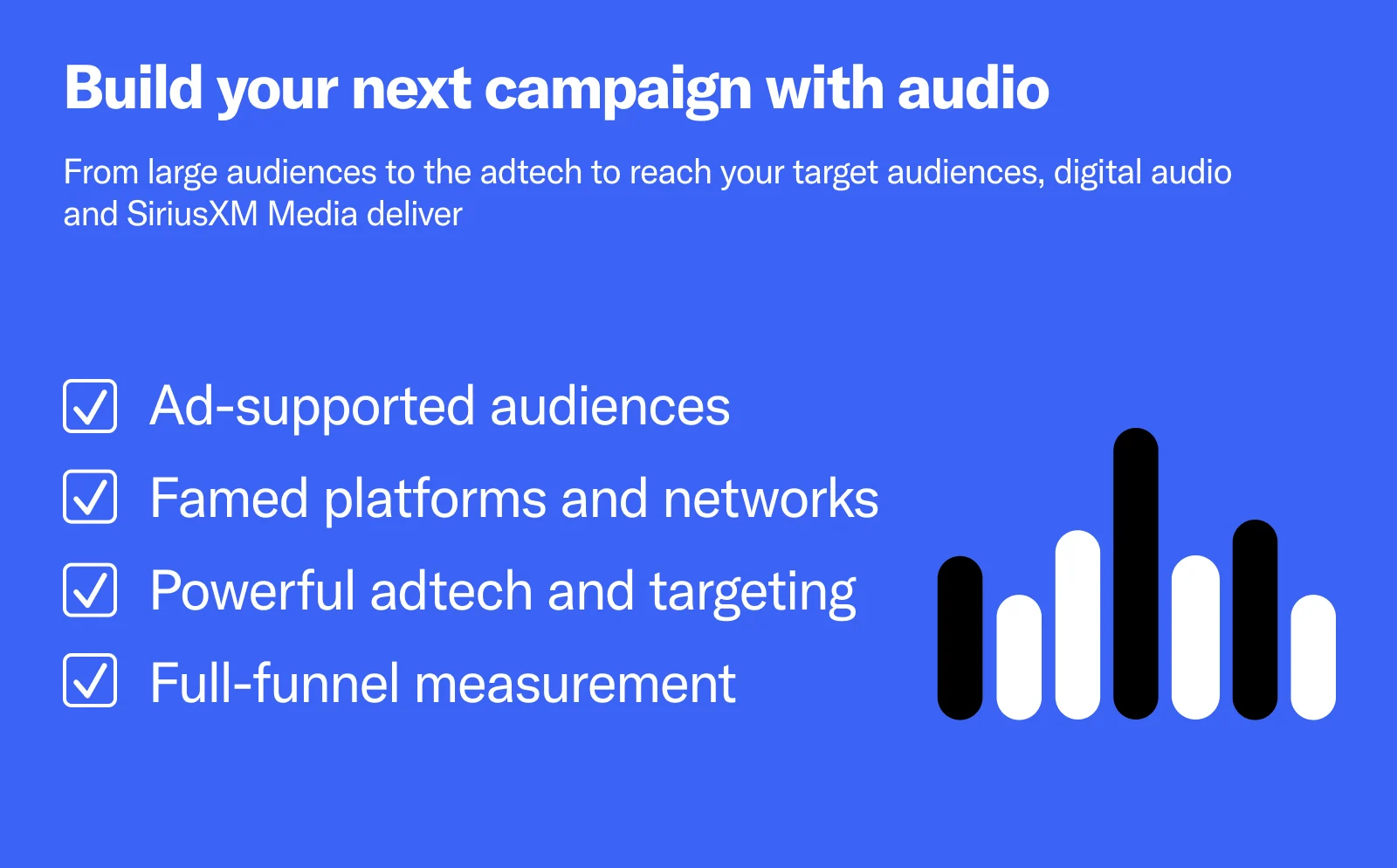 At SiriusXM Media, we’ve built the largest and most addressable ecosystem in audio, giving advertisers unprecedented opportunities to reach ad-supported listeners across platforms, networks, formats, and moments.