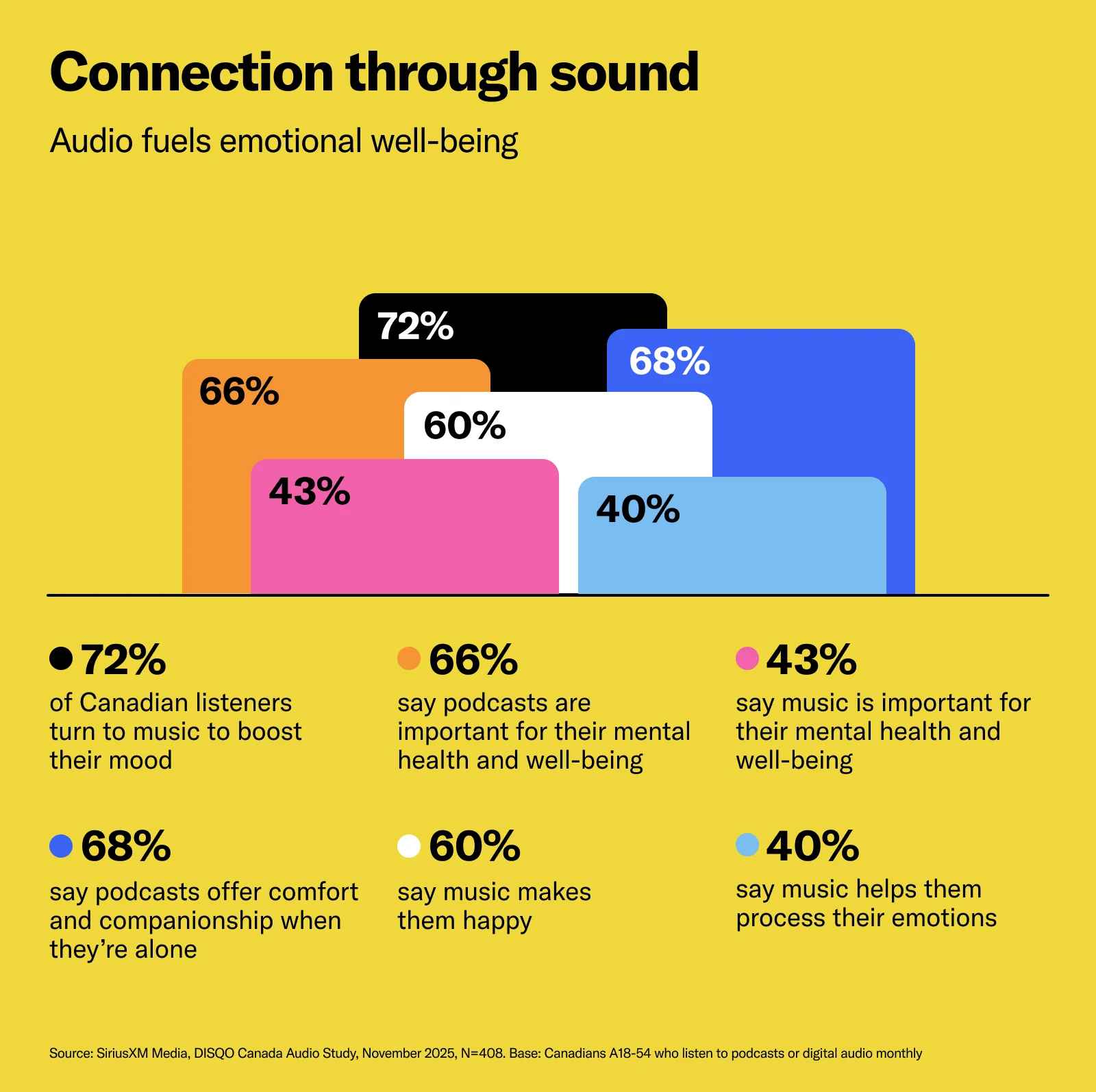 Digital audio continues to gain momentum in Canada, becoming an essential part of everyday life. From music to podcasts, audio is where audiences turn for connection, entertainment, and information. The SiriusXM Media Canada Audio Study, fielded with DISQO in November 2025, offers fresh insights into the Canadian digital audio consumer—revealing a landscape defined by emotion, authenticity, and flexibility. The study explores everything from ad receptivity and time spent with media, to Canadian-specific values and beliefs, to future purchase intentions. Below, we highlight the most compelling findings.