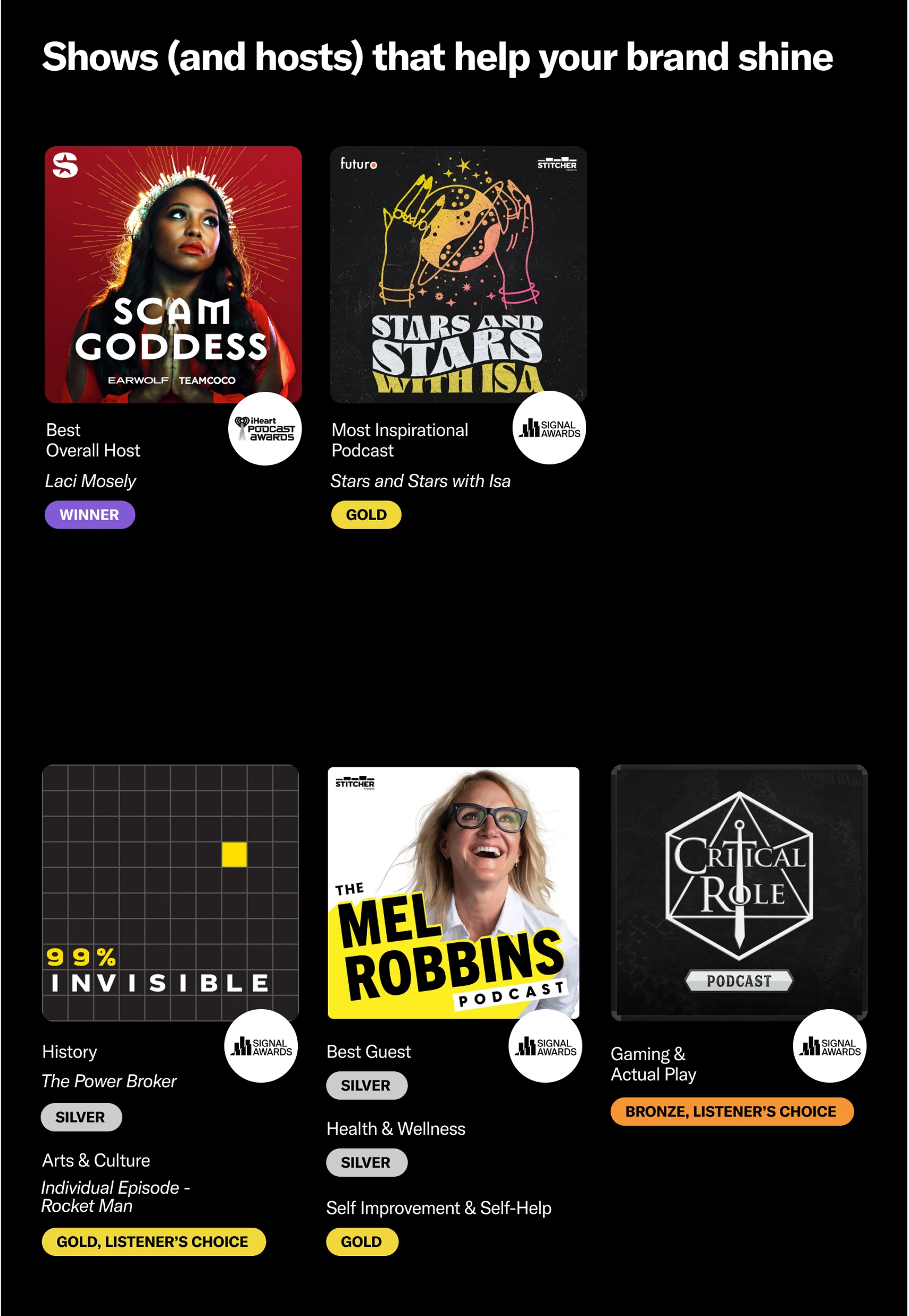 We connect advertisers to the award-winning shows that audiences love. Our dedicated listeners passionately support our diverse portfolio of rich narratives and captivating stories, actively participating in the selection of podcast award winners. They’re investing time and energy in voting for their favorite shows, making the award process a true reflection of consumer passion and dedication. This means brands can effortlessly forge genuine connections and reach a highly receptive community of podcast enthusiasts when choosing to partner with us.