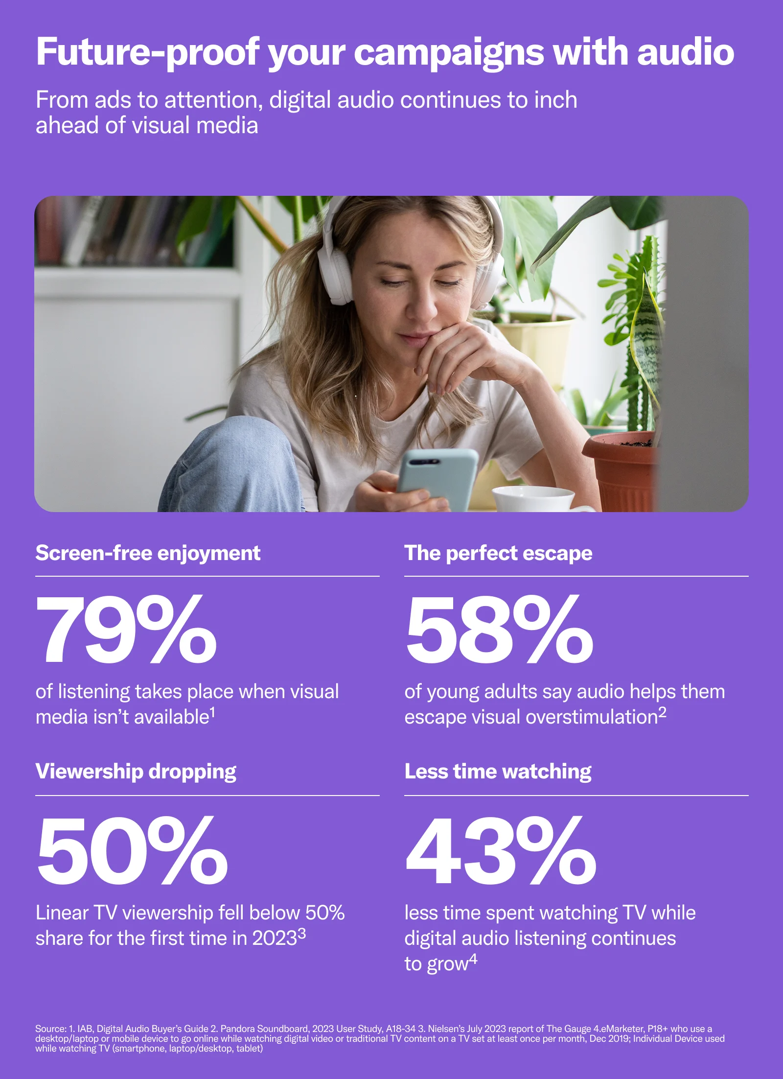 When attention is the most competitive currency, relying solely on screens can’t be the only strategy. Instead, combine visuals and audio for a balanced, future-proofing approach. Media and audience fragmentation may not be going away, but they can be navigated better.