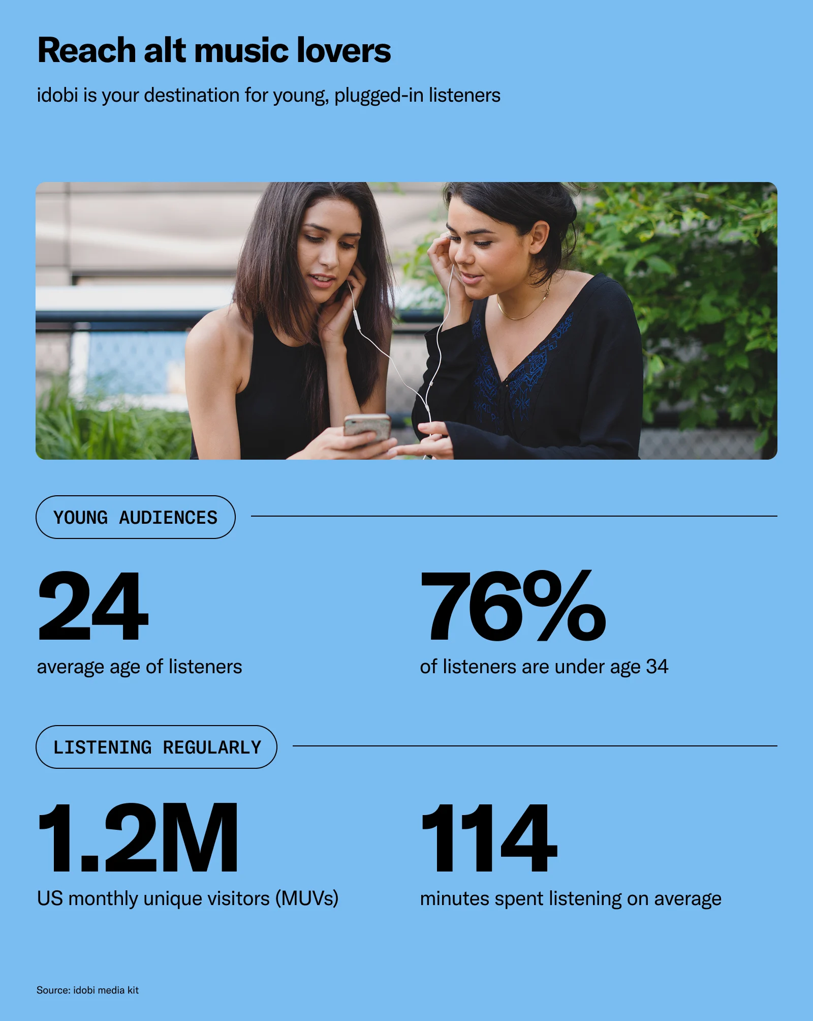 Alternative music fans are some of the first to discover emerging artists and pride themselves on curating playlists that push creative boundaries. idobi resonates deeply with Gen Z and younger millennials.
