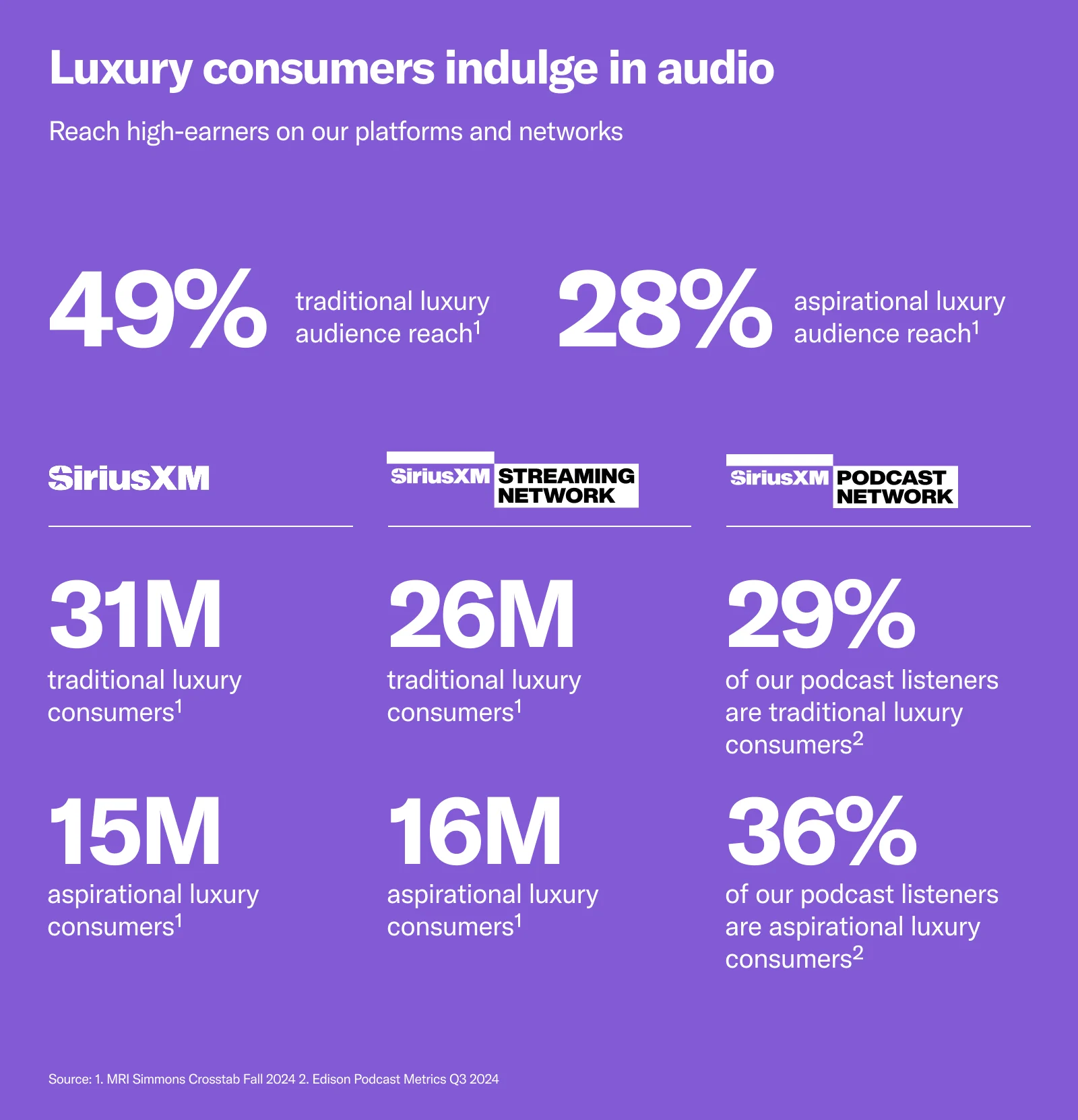 Despite economic shifts, consumers are still looking for luxury experiences, whatever that means to them. Almost eight in 10 (72.6%) of US luxury buyers planned to spend the same amount or more on personal luxury goods from 2024 to 2025. No matter what luxury consumers invest in, the one thing they have in common is their love for digital audio. Whether they’re listening to music, podcasts, or SiriusXM radio, audio sets the soundtrack for their routines and promotes brand discovery.