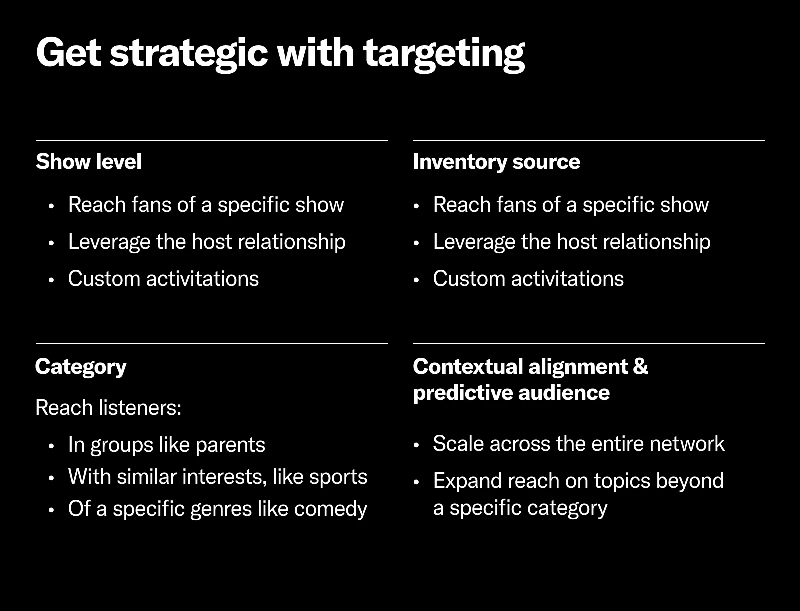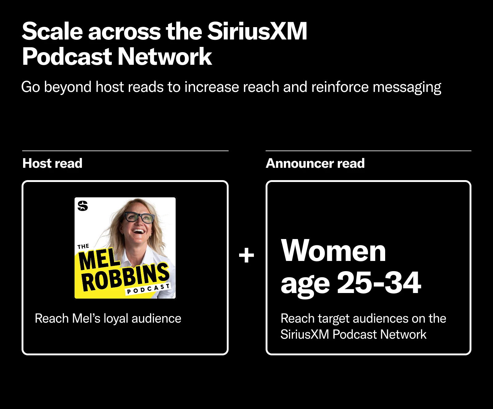 Here’s why scale is important to advertisers of all sizes and verticals: Let's say you’re a direct-to-consumer brand who has a new product aimed at women aged 25 to 34. For host-read ads, you’ll want individual shows that index highly for that demographic, so you can leverage the host’s appeal to speak to their devoted listeners. But to efficiently level up, you'll also want to leverage announcer-read ads that are precisely delivered to that demographic across multiple shows.