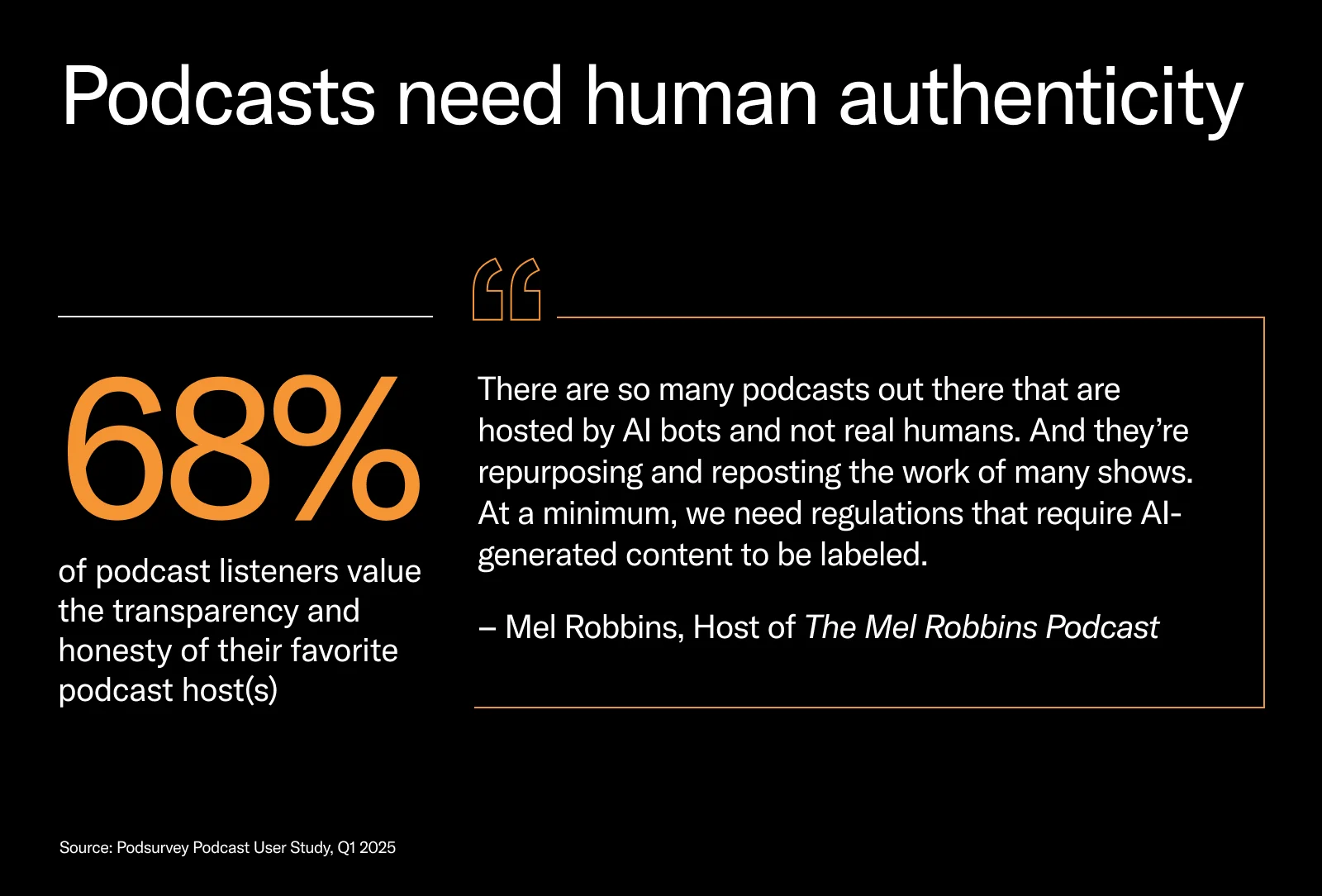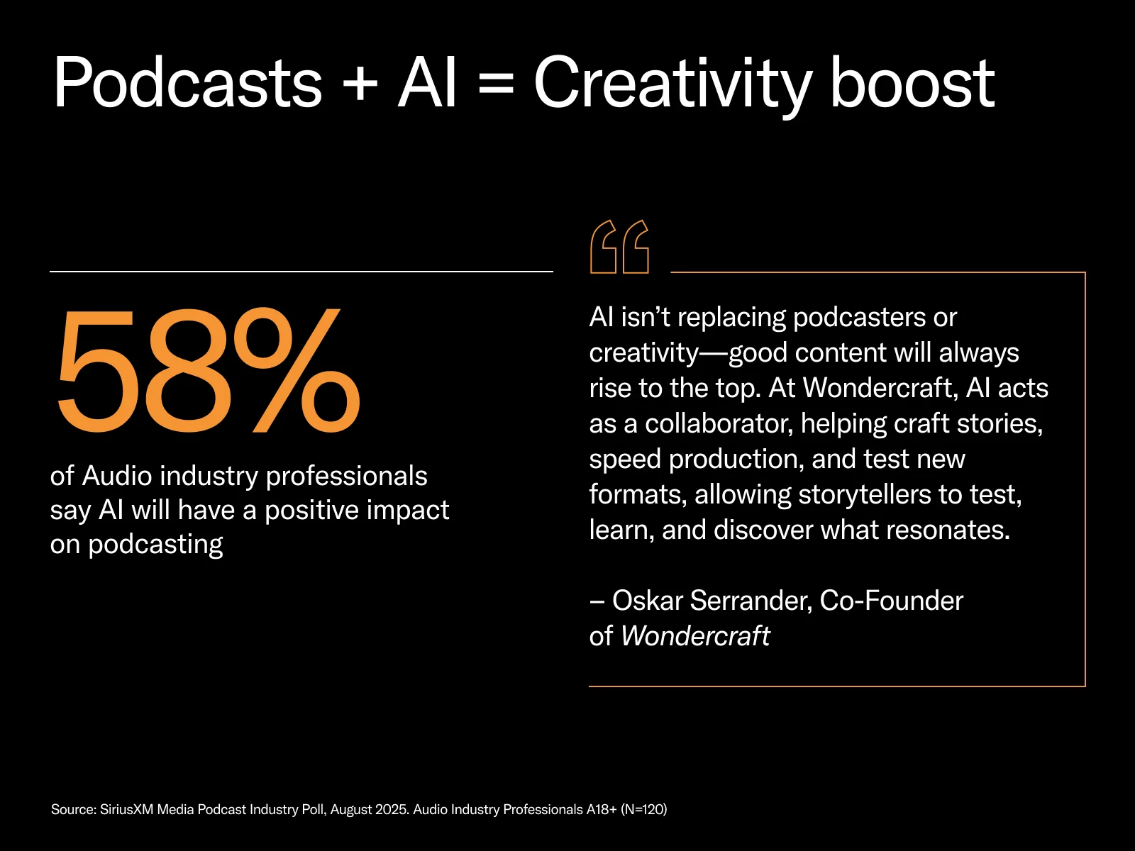 At its core, podcasting is built around the human touch. From editing, to sound, to creative, people play a huge part in making shows feel special. And some see a real risk in letting AI take the wheel too quickly—42% of audio industry professionals say AI will have a negative impact on podcasting, and their concerns don’t come from a fear of technology. They come from a deep understanding of how and why listeners show up.