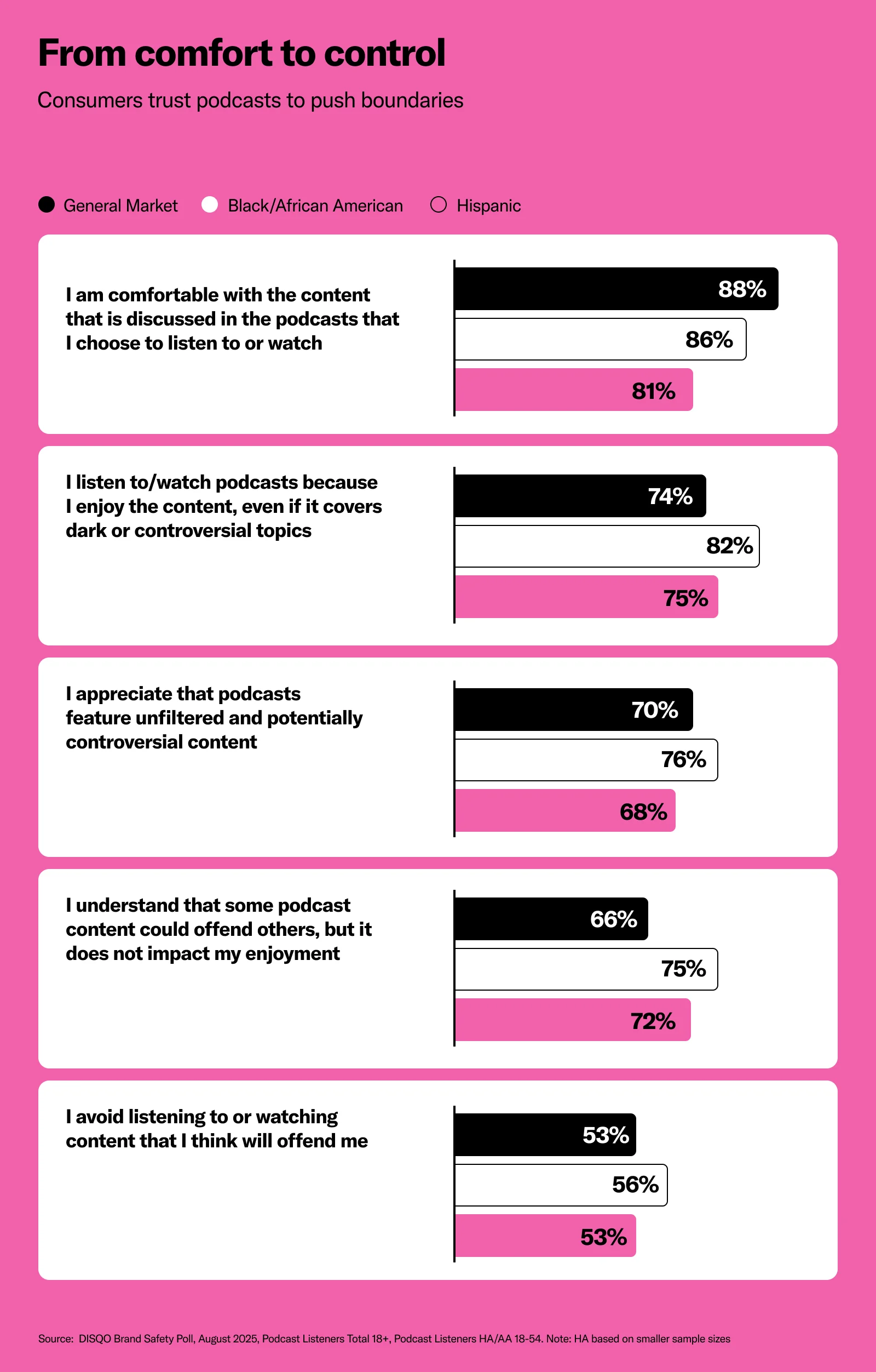 Podcasts have become one of the most intentional, personal, and trusted media channels. Consumers actively choose the shows they follow, creating an environment that feels opt-in and curated. For advertisers, this unique dynamic creates opportunities—and sparks questions. If podcasts are so personal, how do brand safety and suitability play out? How do audiences react when sensitive subjects arise? And what happens to brand perception when ads appear alongside content that some might find controversial?