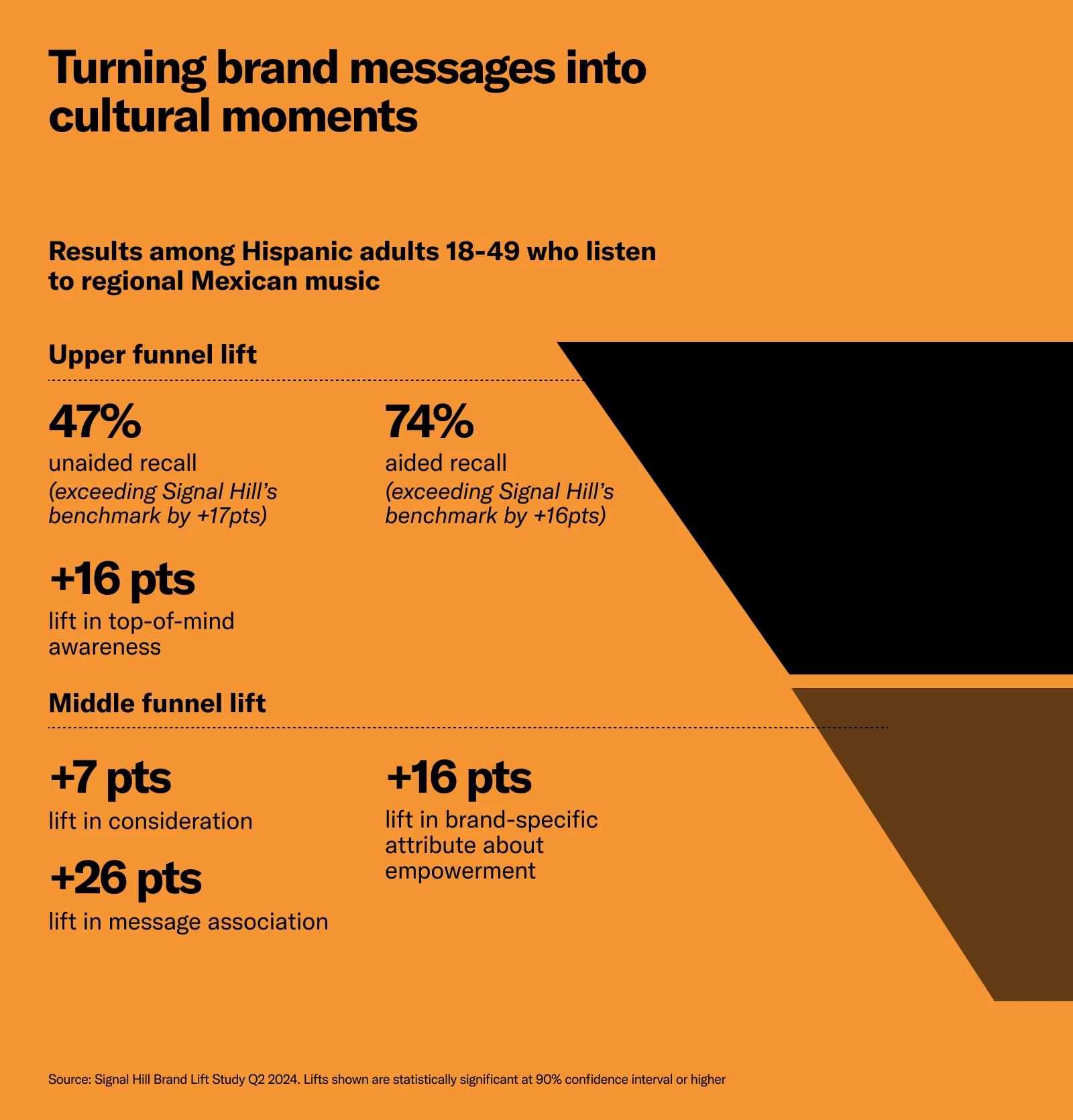 By leveraging advanced targeting capabilities, the auto advertiser effectively reached Hispanic adults ages 18 to 49 who listen to música Mexicana. Using a mix of English- and Spanish-language creatives with contextually relevant themes and sound effects, the brand’s informative messaging resonated with Hispanic and Latino listeners, boosting brand awareness and generating consideration. The campaign successfully generated significant full-funnel lifts for the auto advertiser.