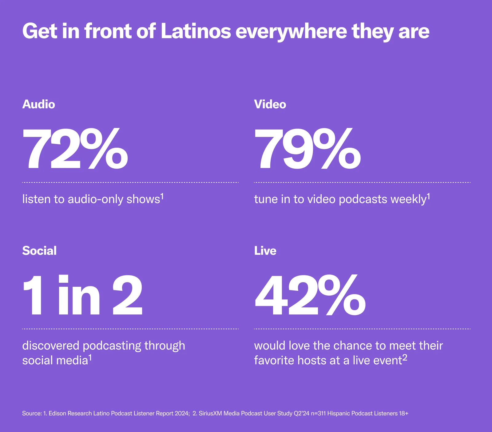 And you can reach them with us no matter where they get their podcasts (whether it’s through Apple Podcasts, Spotify, iHeart, or anywhere else). From new show discovery to connecting with hosts and other fans of their favorite shows, Latinos extend their listening enthusiasm to social media. So, as the podcast medium continues to evolve, you can connect with listeners across media channels, too.