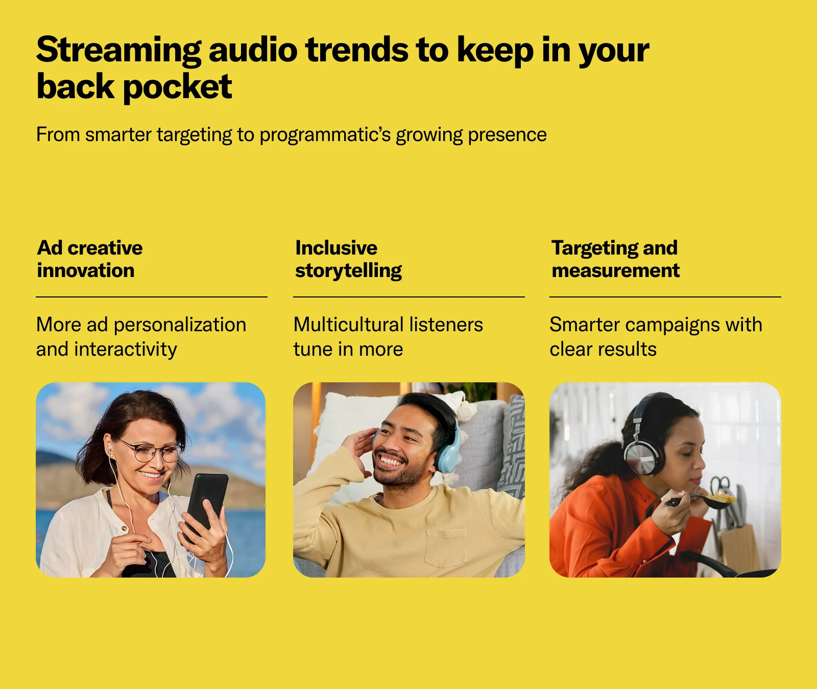 These streaming audio advertising trends point to one clear conclusion: Listeners are more connected than ever and tune in to music for diverse reasons throughout their day. Streaming audio is how brands can meet them in just the right moment and context.