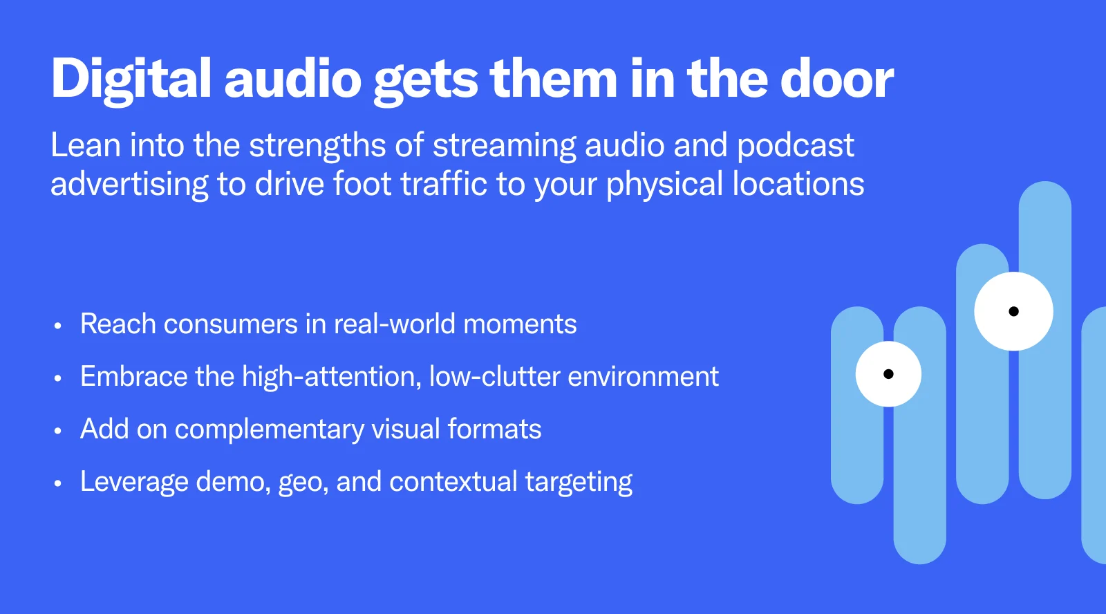 Yes. Streaming music, podcasts, and live talk content offer advertisers a number of advantages that perfectly align with mid- to lower-funnel KPIs like driving foot traffic. Digital audio is with listeners over four hours a day in moments that get brands closer to the point of sale, often when screens are unavailable or inconvenient. 2