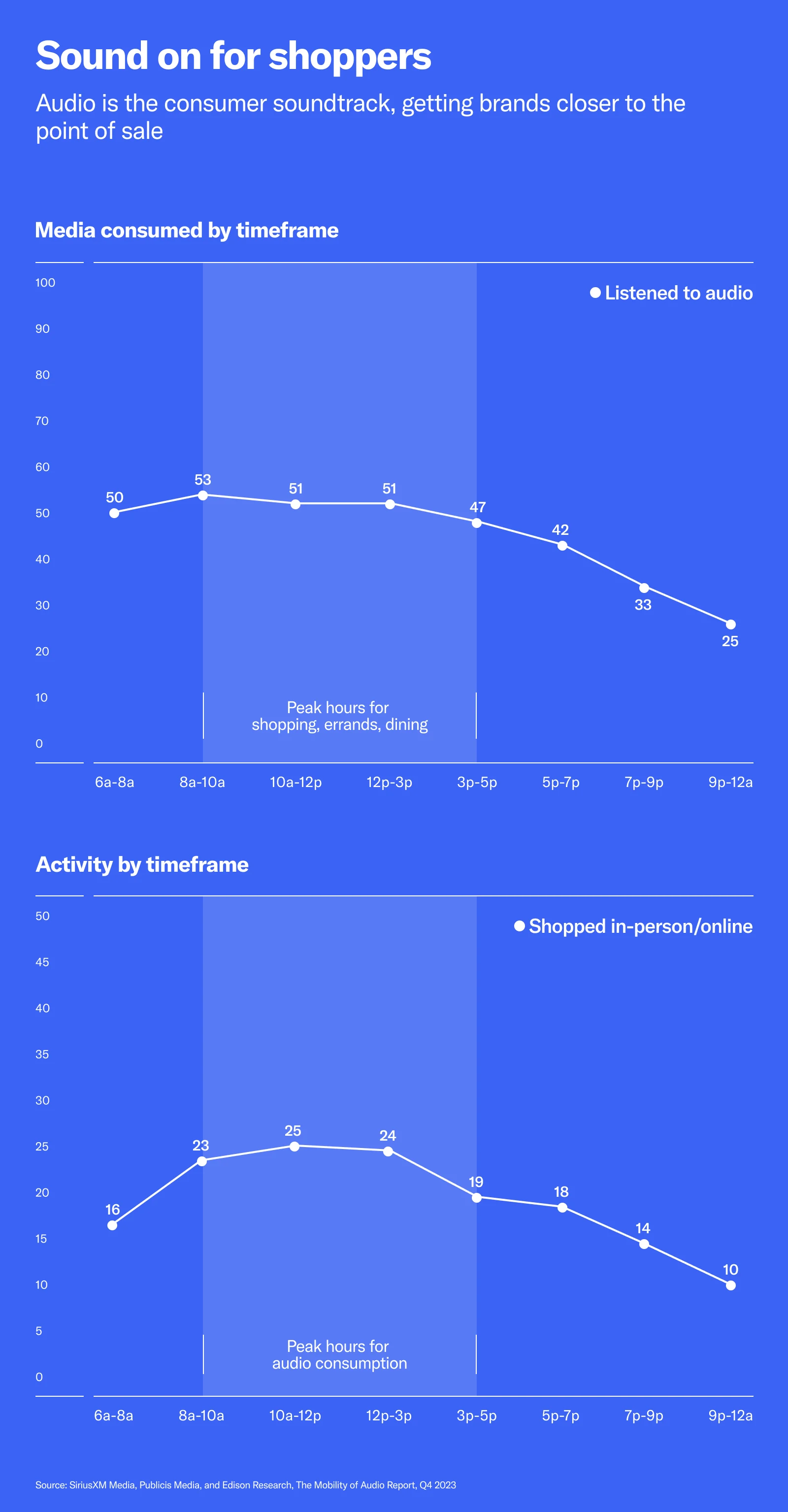 Unlike visual media, digital audio is with consumers when they’re in action. Audio is a constant companion, enhancing everything from cooking and cleaning, to working and working out, to road trips and running errands. And studies show that when audio listening peaks, so does both online and in-person shopping. 3 That means brands can reach consumers when browsing and buying are on their minds.