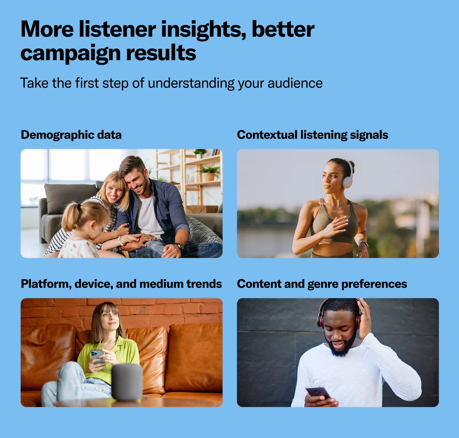 From improving targeting precision (female Gen Zers or male millennials), to developing relevant creative (display or video), to choosing the right platform to advertise on (streaming audio or podcasts), listener insights are a powerful tool.