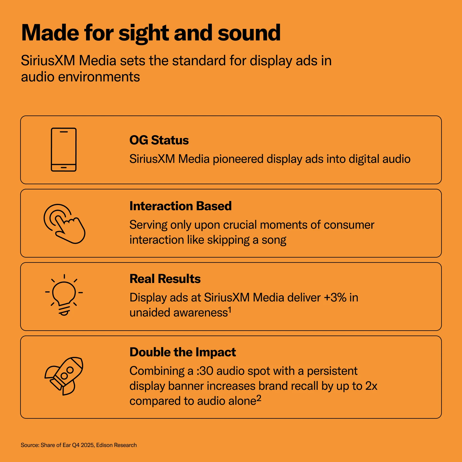 The idea that audio and visual should work together isn’t new—but it’s never been more effective. Display ads on SiriusXM Media platforms deliver +3% in unaided awareness. 2 And pairing a 30-second audio spot with a persistent display unit can drive up to 2x higher brand recall compared to audio alone. 3
