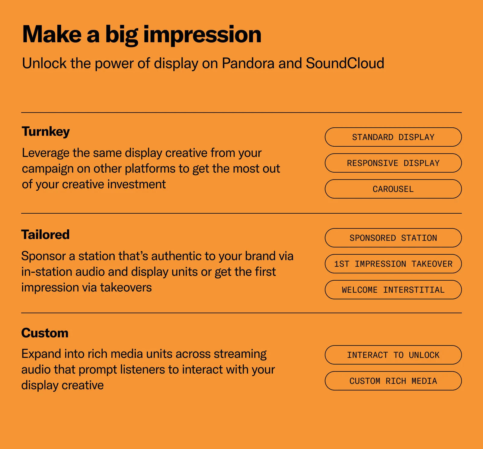 Welcome interstitials: Build top-of-mind awareness on mobile with a rich display unit that appears when the Pandora or SoundCloud app is launched.