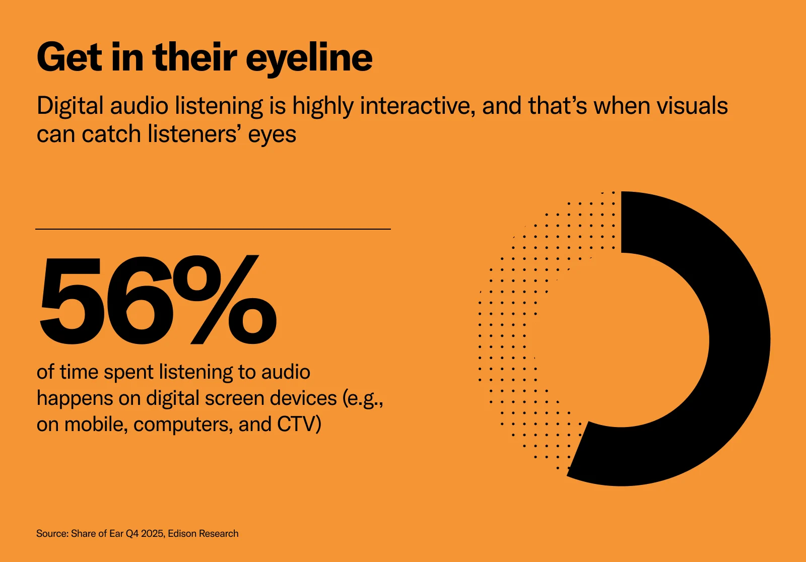 Audio is a powerful, always-on channel—reaching audiences during moments when screens aren’t the focus. But with the rise of digital audio, listening is increasingly happening on devices with screens. Listeners are browsing, curating playlists, skipping tracks, and engaging with content across mobile devices, desktops, and connected TVs. In fact, more than half of all audio listening time now happens on devices with screens, 1 opening the door for a more dynamic, multi-sensory advertising approach.